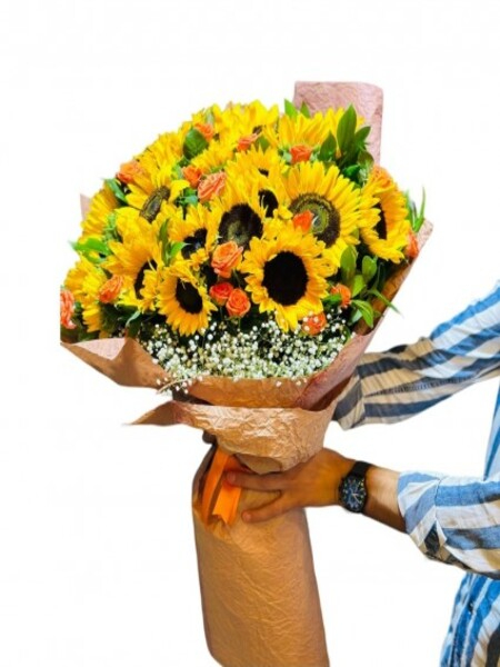 Büyük Ayçiçeği ve Turuncu Gül Buketi
