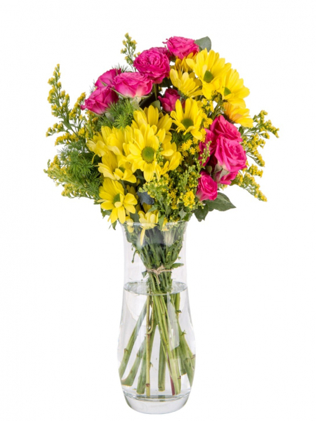 Cam Vazoda Sarı Papatyalar Ve Pembe Güller
