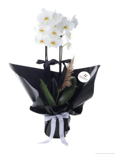 Puantiyeli Saksıda Orkide ve Papatya Aranjman
