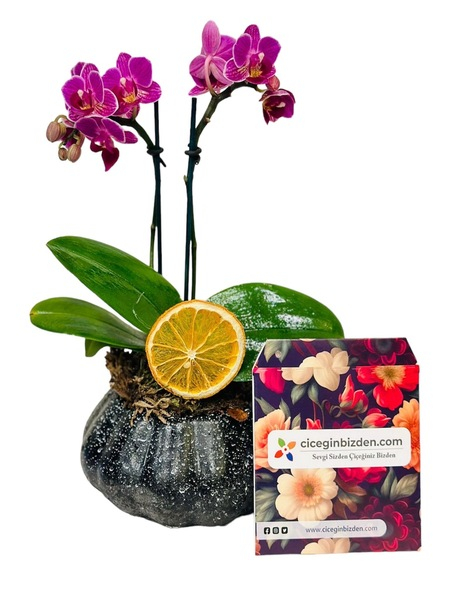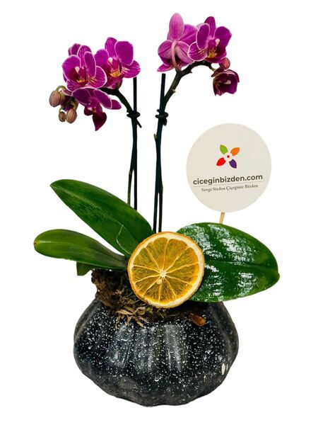 Kabak saksı içerisine dekore edilmiş çiftli mini orkide çiçeği.