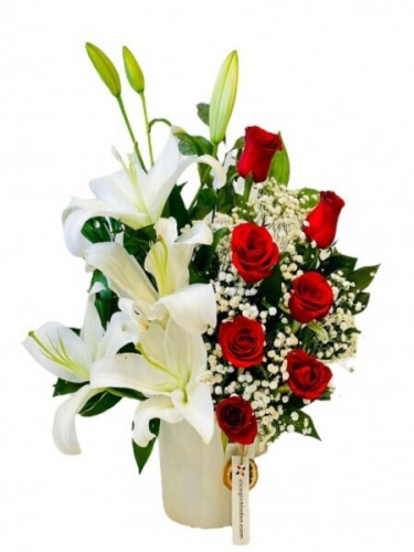 Seramikte Lilyum ve 7 Kırmızı Gül