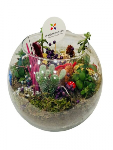 Cam fanus içerisinde sukulent ve aksesuarlardan oluşan teraryum.